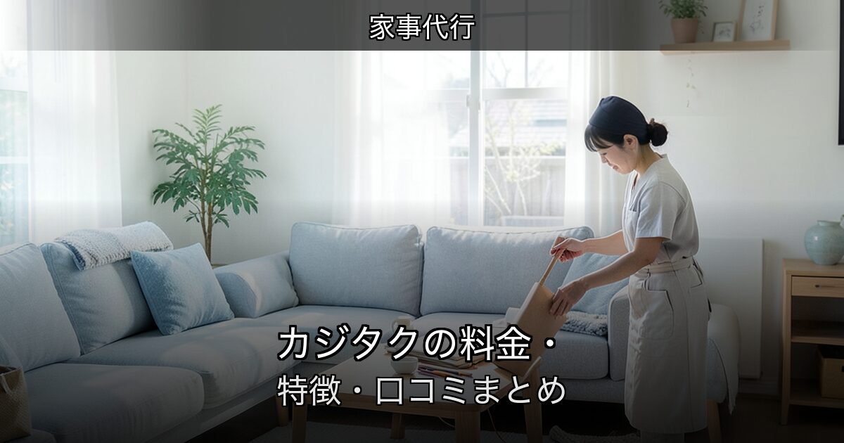 カジタクはイオングループのアクティア株式会社が運営する家事代行サービスです。「家事の宅配」というコンセプトのもと、掃除・料理・ハウスクリーニング・宅配クリーニングなど幅広いサービスを全国一律料金で提供しています。WAON POINTが貯まる・使えるなどイオングループの特典が受けられる点や、見積もり不要のパック料金体系が特徴です。イオンショッピングセンターでの申し込みも可能で、身近に利用できる家事代行として多くの家庭に利用されています。