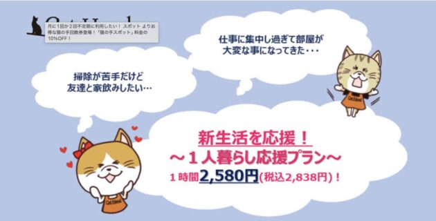 比較的リーズナブルな価格設定で、一人暮らし向けの「ニャンシー・プラン」や、子育て世帯をサポートするプランなど、利用者のニーズに合わせたユニークなプランが魅力です。コストを抑えつつ、定期的に家事をサポートしてほしい方に適しています。